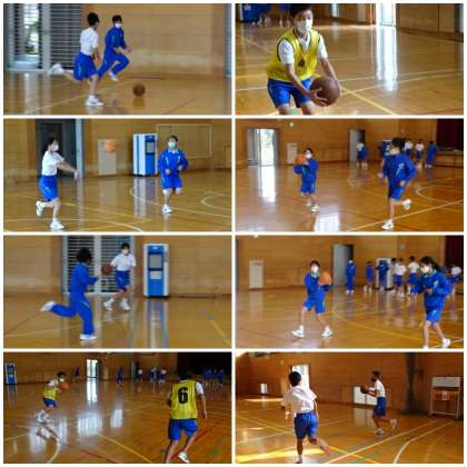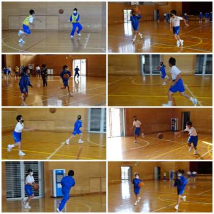 「バスケットボール」の学習です。二人ペアになり、走りながらチェストパスやバウンズパスでボールを前に進める練習をしました。