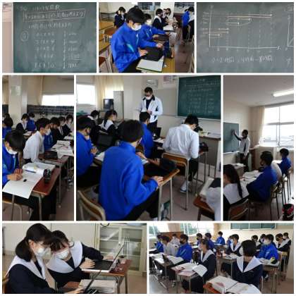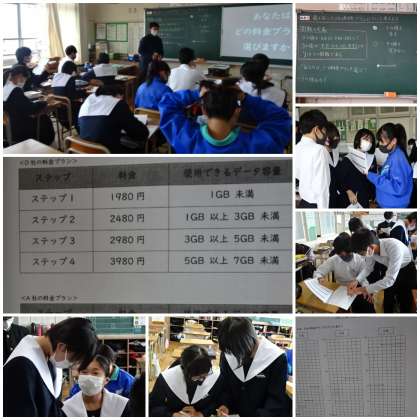 「いろいろな関数」の学習です。2つの数量の関係を式に表すことはできなくても、表やグラフを使って、数量の関係や変化の様子を捉える問題に挑戦しました。