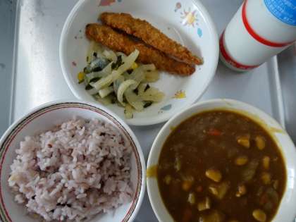今日の給食は、五穀ご飯、牛乳、ビーンズカレー、ししゃもフライ、こんにゃくサラダです。