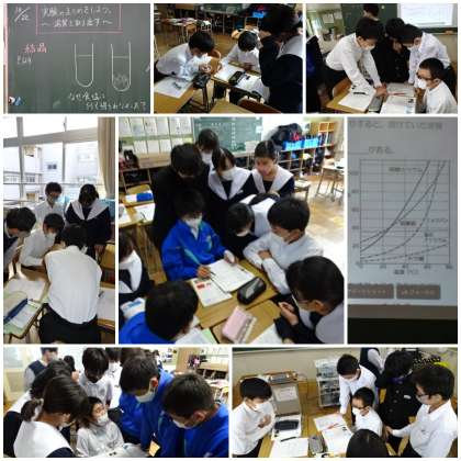 「溶解度と再結晶」の学習です。生徒は前時に「硝酸カリウムの水溶液や食塩水を冷やすと、溶質を取り出せるか実験しました。