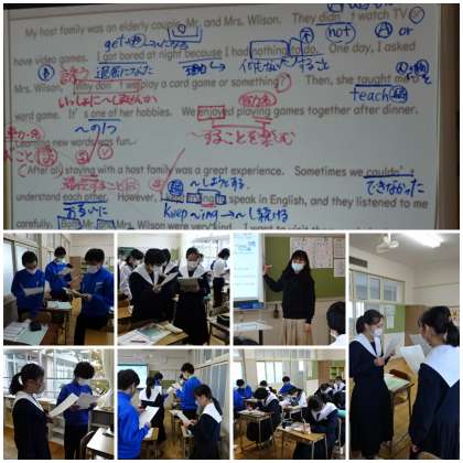 「Unit4 Homestay in the United States」の「Read and Think2」の学習です。本時は本文の内容(ホームステイの体験談)をかみ砕いて読み取りました。また、動詞にingがついた形(「〜すること」)を主語として使うこともできることを学びました。