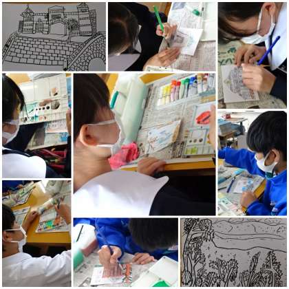 「絵手紙」の学習の続きです。「博物館明治村」でスケッチした絵手紙に着色しています。