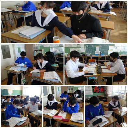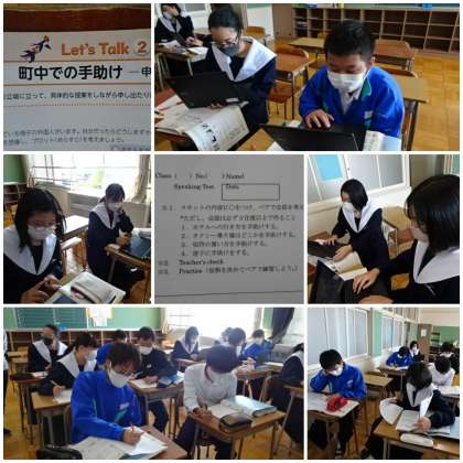「Let's Talk2」の学習です。駅前で困っている様子の外国人がいます。具体的な場面(ホテルへの行き方を手助けする、タクシー乗り場はどこか手助けする、切符の買い方を手助けする、迷子に手助けする)を想定し、ペアで「スキット」が完成するように文を考えました。
