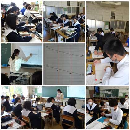 第2節「平行線と線分の比」の導入の場面です。授業者は「罫線の入った紙を折って3等分にします。測らずにできますか?」と生徒に投げかけます。
