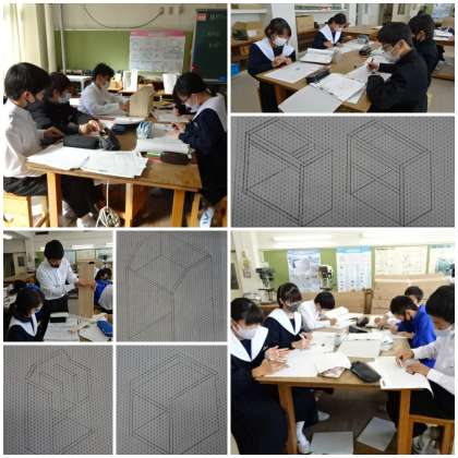 「木工」の「製作の計画を立てよう」の学習です。自分が作製したいものの構想に基づいて等角図を用いて作図しました。