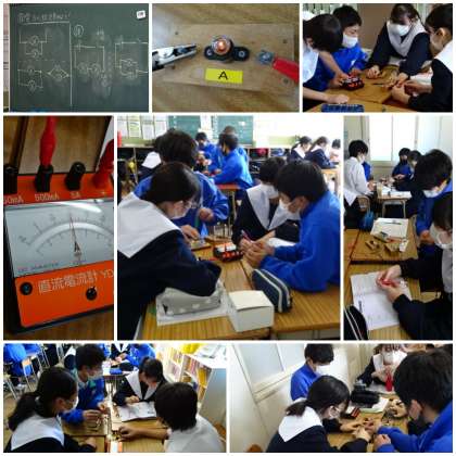 「電流と回路」の学習です。電流計の使い方を学んだあとに、豆電球の前後を流れる電流の大きさを調べました。実験の結果から、豆電球に流れ込む電流と流れ出る電流の大きさにはどのような関係があるか考察しました。