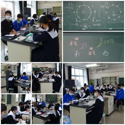「惑星の運動と見え方」の学習です。内惑星と外惑星に分けて、惑星の動きや見え方について学習しました。ちょうど、ここ数日は日没後に、南西の方角に三日月、木星、金星、土星が見られるそうです。肉眼で十分に見られるので、ぜひ眺めてください。