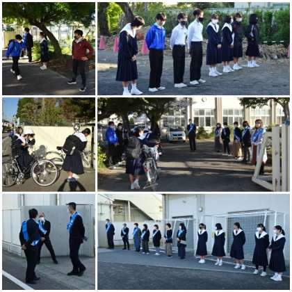 生徒の通用門である東門と西門で、生徒の登校の様子を見ながらあいさつを交わしました。天気もよく、気持ちよくあいさつができました。