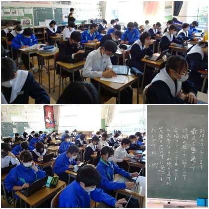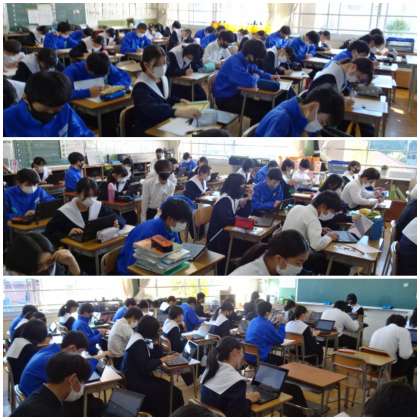 タブレットを開けている生徒は、校外学習のアンケートに答えているか、数学科コンクールの練習問題を解いている生徒です。