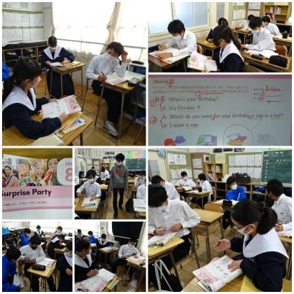 「Unit8 A Surprise Party」の「Starting Out」の学習です。ペアになり英語で互いの誕生日を尋ね合ったり、次の誕生日プレゼントにもらえるとしたらどちらがほしいかを尋ね合ったりしました。