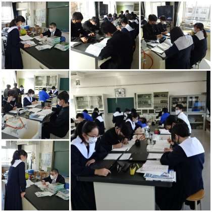 本時は「化学変化とイオン」の単元末問題、読解力問題、「よくわかる理科の学習」の問題に取り組みました。分からない問題を教科担任に質問する生徒もいました。
