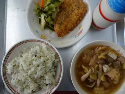 今日の給食は、愛知の大根葉ごはん、牛乳、マトウダイのフライ、茎わかめとキャベツのあえもの、愛知の紅葉汁です。