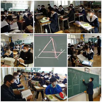 「平行線と線分の比」の学習です。本時は平行線にはさまれた線分の比の関係の逆、つまり線分の比が等しいならば平行線といえるかどうか考えました。どこに補助線を引くかがポイントです。平行を証明するには……。