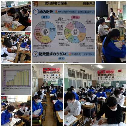 「地方公共団体の課題」の学習です。「都道府県ごとの歳入とその内訳」や「地方債の発行残高の推移」などの資料から、地方公共団体にはどのような課題があるのか考えました。地方公共団体の組織の効率化や財政強化を期待して市町村合併の動きが加速したことは記憶に新しいところです。