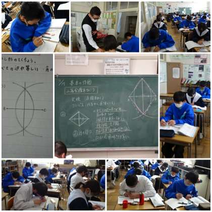 「基本の作図」の学習です。線分の垂直二等分線や角の二等分線の作図の仕方について学び、実際にコンパスと定規を使って作図しました。