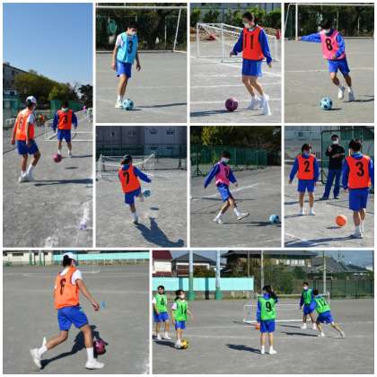 「サッカー」と「バレーボール」の学習です。「サッカー」ではパス、ドリブル、シュートの練習後にミニゲームを行いました。「バレーボール」の学習では、ルールを一部変更してミニゲームを行いました。