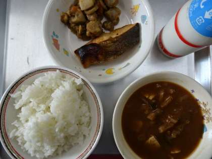 今日の給食は、ごはん、牛乳、サケの塩焼き、にしめ、豆腐のみそ汁です。