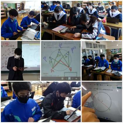 「円の性質」の導入場面です。板に打ちつけたくぎに糸をかけてつくる「ストリングアート」という工作があります。このストリングアートをつくっているときにできる角のきまりに着目しました。円周角と中心角に何かしらのきまりを見つけました。