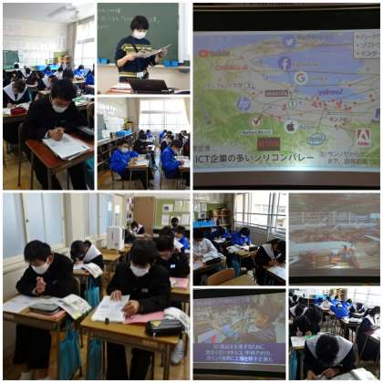 「北アメリカ州」の「巨大な工業生産力」の学習です。アメリカの工業の発展を地域、業種の面から整理しました。シリコンバレーにはICT関連企業など市場を席巻する「GAFA」と呼ばれる企業が集積していることを学びました。