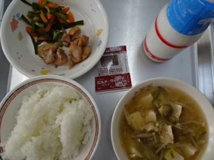 今日の給食は、ごはん、牛乳、焼き鳥、茎ワカメのあえもの、ちゃんこ汁、ココア牛乳のもとです。