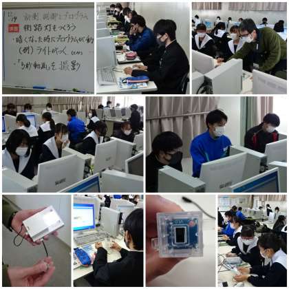 「計測、制御とプログラム」の学習です。単元の課題は「街路灯をつくろう」です。赤外線フォトリフレクタを使って、「暗くなった時にプログラムが起動してライトがつく」ようにプログラミングをして、センサーに反応してLEDが点灯することを確認しました。