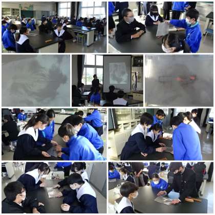 下は「磁界のようす」の学習です。磁石や電磁石のまわりの磁界は、どのようになっているのか、その様子を調べました。鉄粉の入ったクリアファイルを棒磁石の上に静かに置き、ファイルを軽くたたき、できた模様を観察しました。