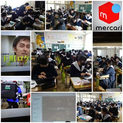 「企業の種類」の学習です。身近な地域にあるさまざまな企業を挙げ、分類しました。ベンチャー企業と呼ばれる企業の具体例をいくつか挙げて業務内容を確認したり、布袋中学校に隣接する「株式会社チゥキヨー」が掲げる企業の社会的責任(CSR)について考えたりしました。