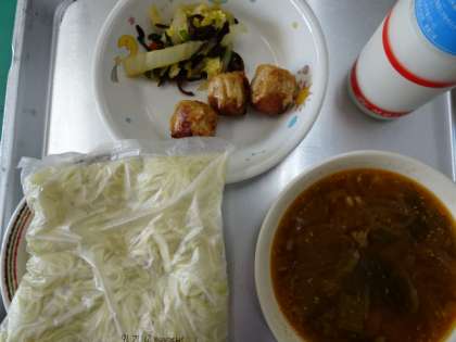 今日の給食は、担々麺、牛乳、揚げ焼売、白菜とキクラゲの中華サラダです。