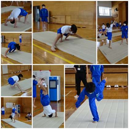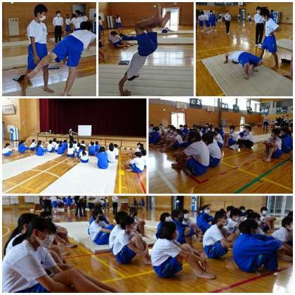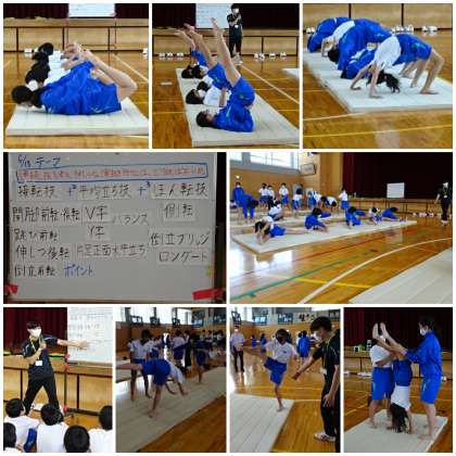 「マット運動」の学習です。教育実習生が授業を行いました。本時の学習課題は「連続技を考え、きれいな演技を行うにはどうすればよいか」です。