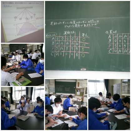 「運動エネルギーと位置エネルギーの間にはどのような関係があるのだろうか」の学習です。振り子を使った実験で、位置エネルギーと運動エネルギーの関係性を考え、図表にまとめました。