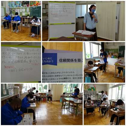 78組道徳科「卒業文集最後の二行(内容項目:公正、公平、社会正義)」の学習です。いじめをなくす一つの方法は、「互いを認め合う言葉をかける」ことです。「ありがとう」「ごめんなさい」という二つの言葉は魔法の言葉です。
