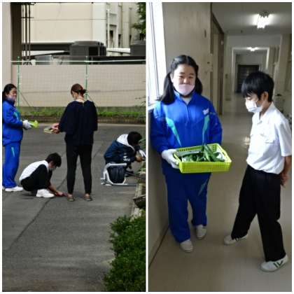 学級花壇で栽培していた「きゅうり」を収穫しました。おいしそうなきゅうりがたくさんとれました。
