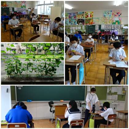 78組教室の窓越しからは、きゅうりが大きく成長している様子が見られます。