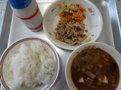 今日の給食は、ごはん、牛乳、豚肉の胡麻ダレ焼き、彩り炒め、なすのみそ汁です。