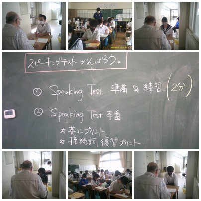ALTグリーン先生による授業です。本時はグリーン先生とスピーキングテストを行いました。生徒たちは今まで学習した英語表現を使い、評価カードを見ながら、緊張した面持ちで試験に臨んでいました。
