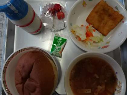 今日の給食は、サンドイッチパンズパン、牛乳、白身魚のフライ、タルタルソース、ボイル野菜、レタスとトマトのスープ、さくらんぼです。