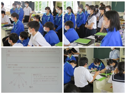 昨日、6月22日(水)の5校時に3年生理科 「運動とエネルギー」の単元で研究授業が行われました。この授業は新任から6年目を迎える中堅教諭の研修も兼ねています。地区内の小学校から教科指導員の先生をお招きしています。
