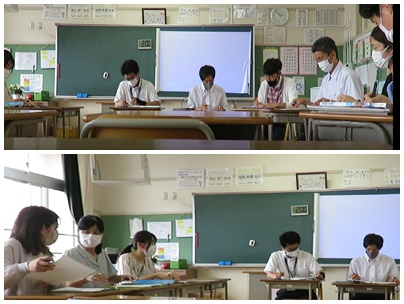 その後の研究協議会では、教科指導員の先生から、より深い学びを追究するためには「生徒の思考を揺さぶる」ことの必要性、また、教師が正解を伝えるのではなく、「生徒同士の議論の中から正解に近づけていく」ことが有効であると、ご助言をいただきました。研究協議会に参加した職員も一緒に課題について考える場面があり、皆が中学生に戻った気持ちで考えを出し合いました。