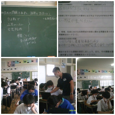 「生物育成の問題を発見し、課題を設定しよう」の学習です。家庭、学校、地域、社会における生物育成の問題を見つけました。皆の意見を出し共有することでたくさんの問題がでました。そこから自分で解決できる課題設定をし、対応を考えました。