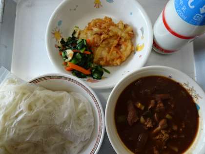 今日の給食は、みそ煮込みうどん、牛乳、愛知県産野菜のかき揚げ、豆腐と小松菜の和風あえです。