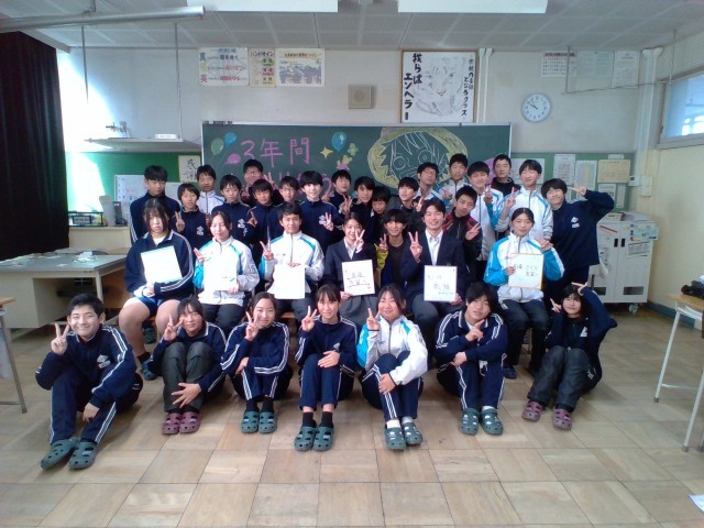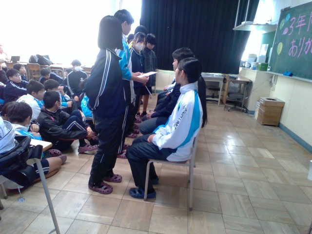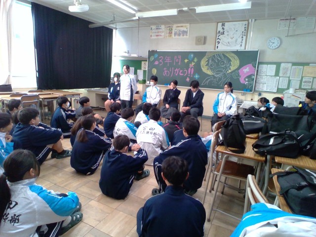 初めにレクをして楽しんだ後、3年生から後輩に向けて言葉を貰ったり、1・2年生が作成したメッセージ入りの色紙を3年生に渡したり、現部長から3年生に言葉を贈ったりしました。