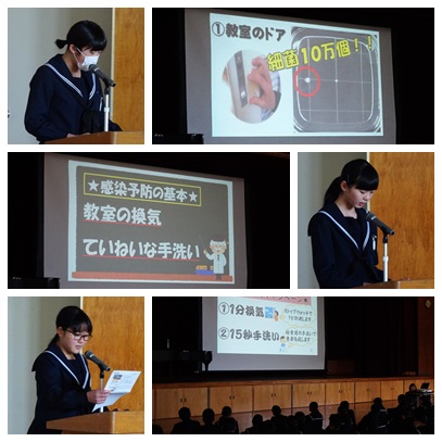 始業式後、「保健豆知識特別編」として、保健委員会が、インフルエンザや風邪の予防について説明してくれました。