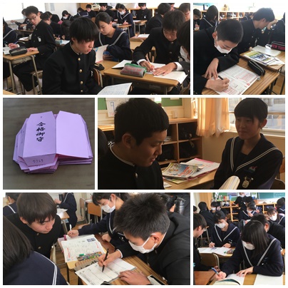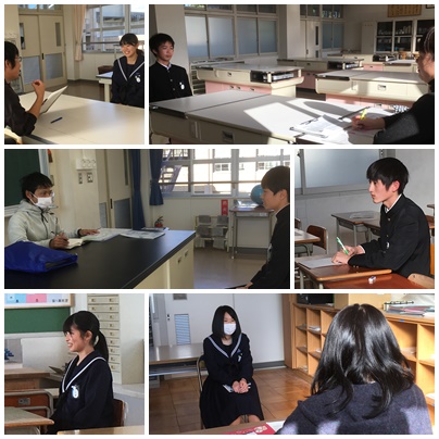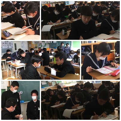今日は5限に、面接練習(初 対面式)が行われたり、教室で仲間と質問し合ったり、ワークシートを記入したりなどの活動がありました^−^もちろんテスト勉強もしっかりとやれているクラスもあります♪