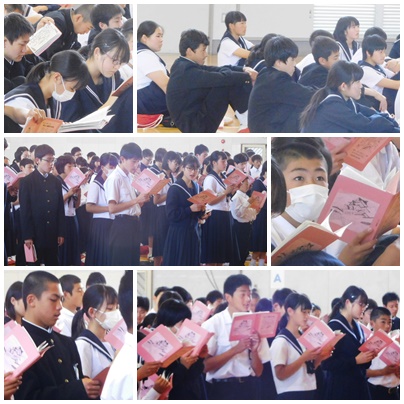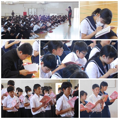 今日の5時間目は、体育館に集合して、歌の練習や隊形の練習、行程の最終確認などを行いました。みんな真剣な表情で、先生の話を聞いたり、大事なことをメモしたりしていました。