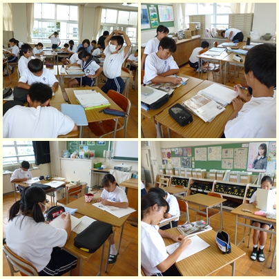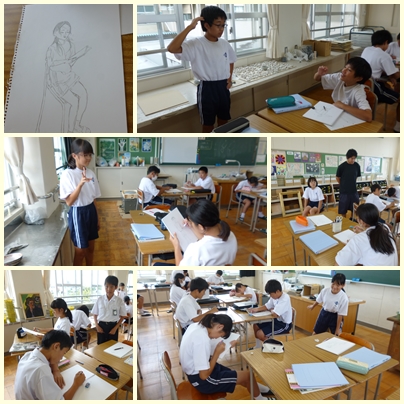 今日の美術の時間(3組)は、ペアでお互いにポーズをとり、その姿を描くことに挑戦しました。脚や腕など、曲線がある人の姿を描くのは難しいですね。それぞれいろいろなポーズをとり描いています。作品完成が楽しみです♪