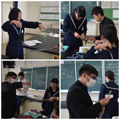 ポリエチレンの紐をで擦りマイナスに帯電させ、反発させ。クモの巣のような紐を浮かせる実験でした。