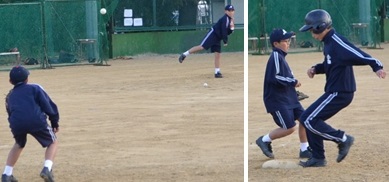 野球部、牽制の練習をしています。実践で使えるようにがんばってください。
