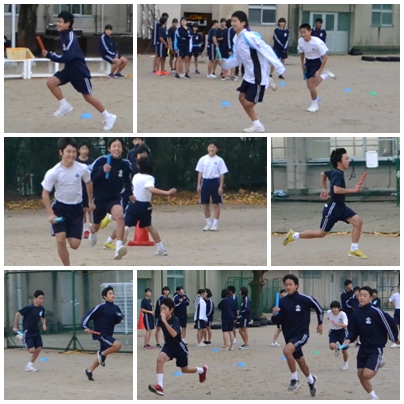 陸上部、外で活動し始めたら小雨が降り出してしまいました。少し濡れているとおもいますので、頭などしっかり拭いておきましょう。雨模様のときはタオルを持ってくることも必要かもしれません。