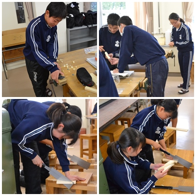 一枚の板を切断し、正確に小物入れの材料を切り出しています。けがき線通り正確に切断できている子たちが多く感心しました。お互いに切ったところを見合って感想を述べ合う姿も見られました。