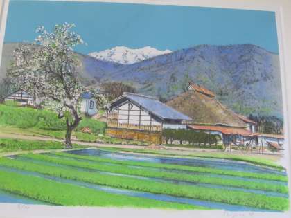 写真の版画は、森清治郎氏の版画『安曇野早春』です。